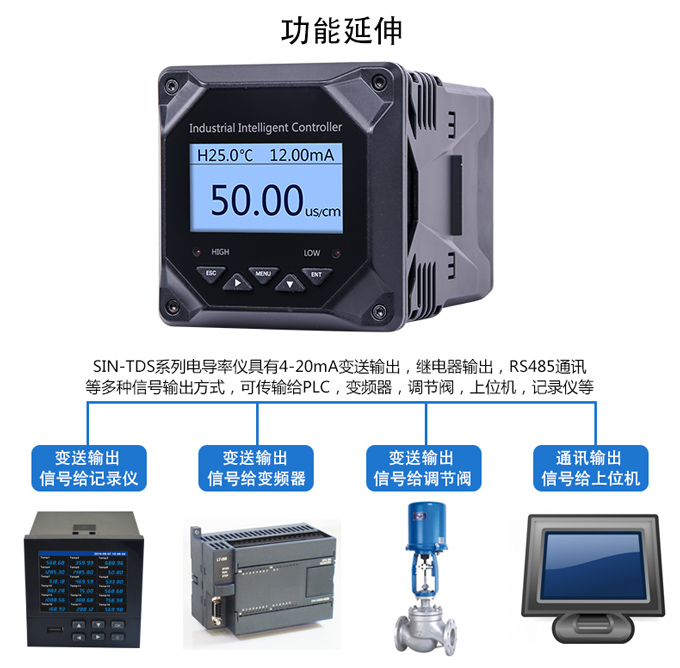 SIN-TDS210工業(yè)電導率儀表,可對各種工業(yè)用水的電導率(TDS)值進行連續(xù)測量和控制,本裝置廣泛應用于科學實驗裝備、化工、制藥、環(huán)保、冶金、造紙、食品、飲料及供水等行業(yè)。根據(jù)水工業(yè)的環(huán)境和特點結合國際供電標準,考慮了特殊環(huán)境的電氣設計規(guī)范,增加了220VAC供電。